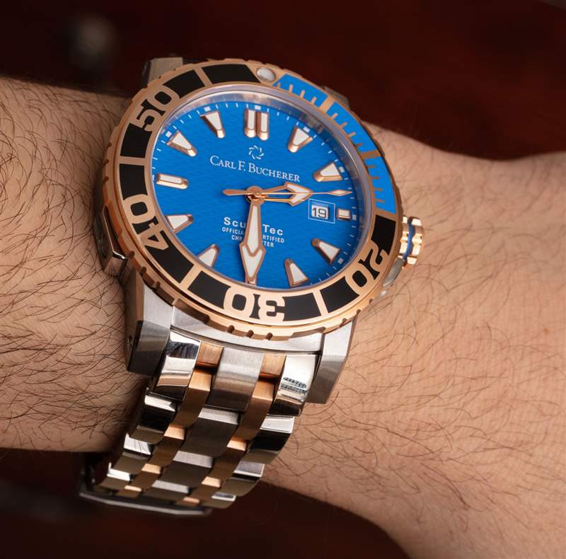 Patravi ScubaTec 是位于盧塞恩的Carl F. Bucherer 的高端潛水表系列。目前最受鐘表愛好者歡迎的就是Carl F. Bucherer款。與許多努力探索新設計的豪華時計一樣,Patravi ScubaTec 在近十年前最初發布時并沒有立即取得成功。今天,隨著 Carl F. Bucherer 將其大部分營銷重點轉移回西方(包括歐洲和美國),Patravi ScubaTec 等型號(此時手表有許多變體)將成為那些時計這將引起很多關注。今天,我回顧了一款帶有亮藍色表盤的雙色鋼和 18k 玫瑰金 Patravi ScubaTec,參考 00.10632.24.53.21。
