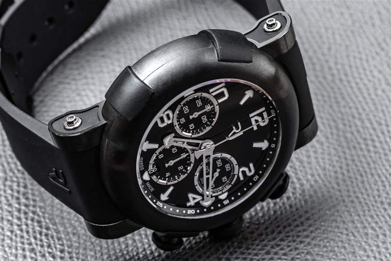 顧名思義,Arraw Marine Ceramic 采用黑色陶瓷作為主要表殼材料。RJ 做得很好,使陶瓷具有水平拉絲飾面,實際上使它看起來像金屬。如果你告訴別人這是一塊黑色涂層的金屬表,他們會相信你的。這意味著您可以獲得具有陶瓷耐刮擦性的金屬手表。其他表殼材料包括一些金屬以及橡膠中的“RJ 保險杠”,這些橡膠保險杠來自一些前 Romain Jerome 手表表盤上的“X”形狀。