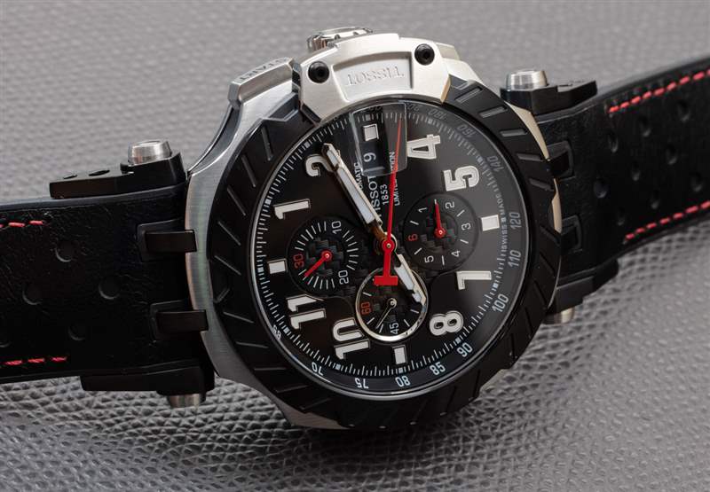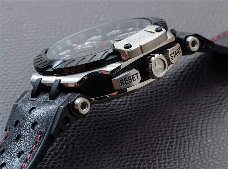 22 毫米寬的表帶和整體寬大的比例讓 T-Race 自動計時碼表感覺很大,但可移動的表耳和高品質的橡膠表帶使其佩戴舒適,不會在手腕上漂浮。表殼本身防水深度達 100 米,由鋼制成,表殼的某些部分(例如中間)帶有啞光黑色 PVD ??涂層。表冠和按鈕周圍的細節很好,整體貼合度和光潔度都很好。