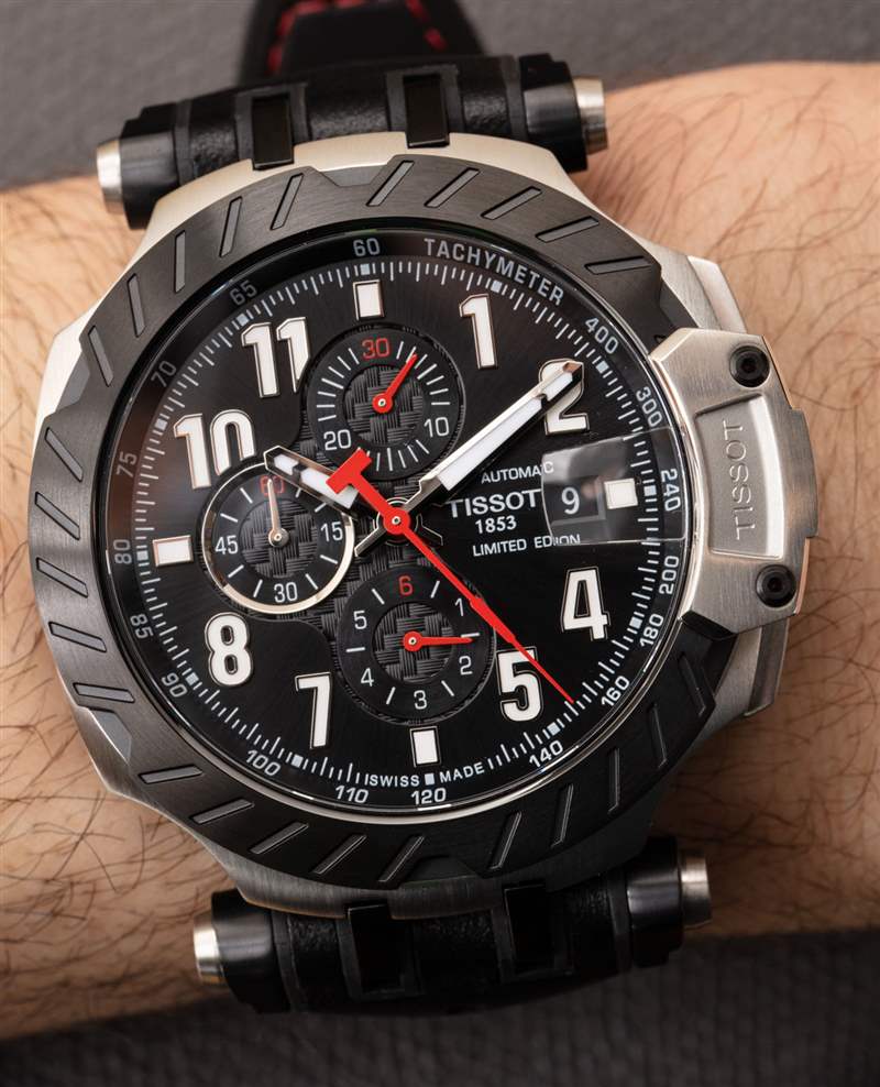 您要么喜歡或討厭 T-Race Automatic Chronograph 表殼,但不可否認它非常舒適。鑒于其龐大的尺寸和質量,這說明了很多。表殼寬 45 毫米,厚約 16.5 毫米。它還具有大約 49 毫米的凸耳到凸耳距離,實際上還不錯。雖然這沒有考慮到鉸接式表耳,這確實有助于 T-Race 表殼和表帶整齊地貼合在大多數手腕上。