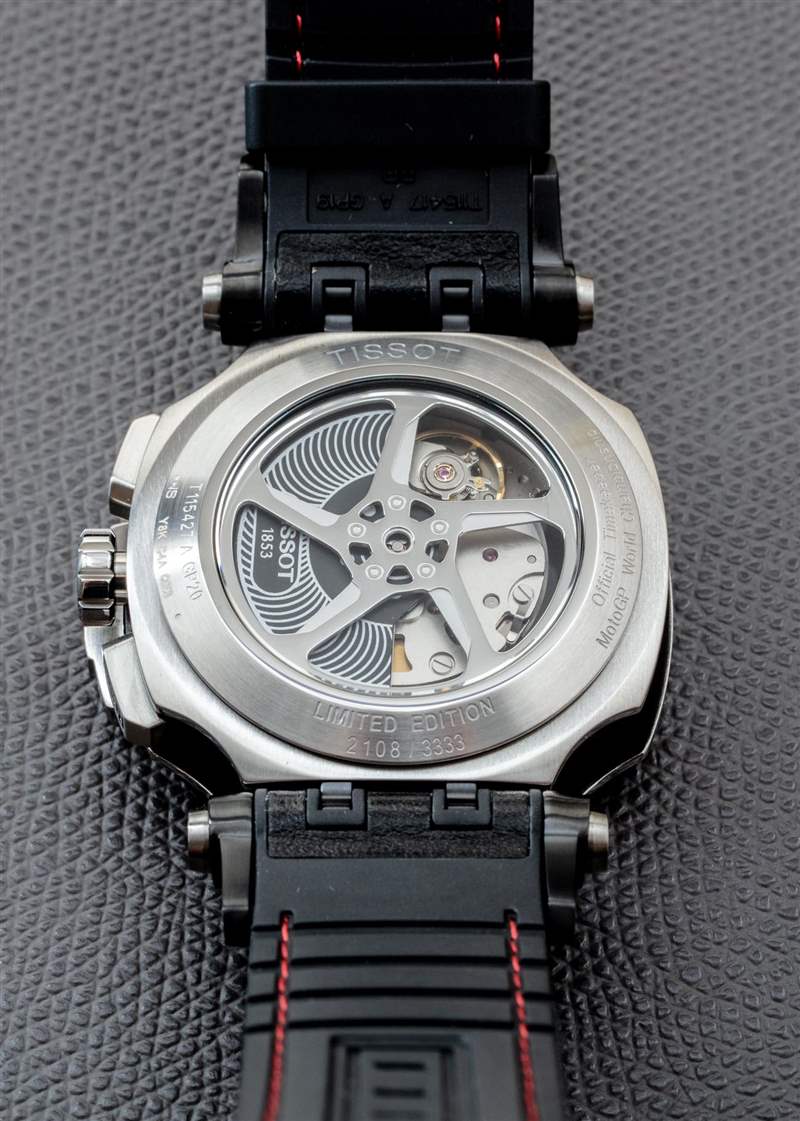 5100 機芯并未在此處直接復制,但其核心元素是,對我而言,這讓 C01.211 更有趣。機芯看起來不太漂亮,但通過手表后部的摩托車輪式窗口可以部分看到它,這很整潔。不要錯過天梭獨有的自動轉子設計上的有趣設計。
