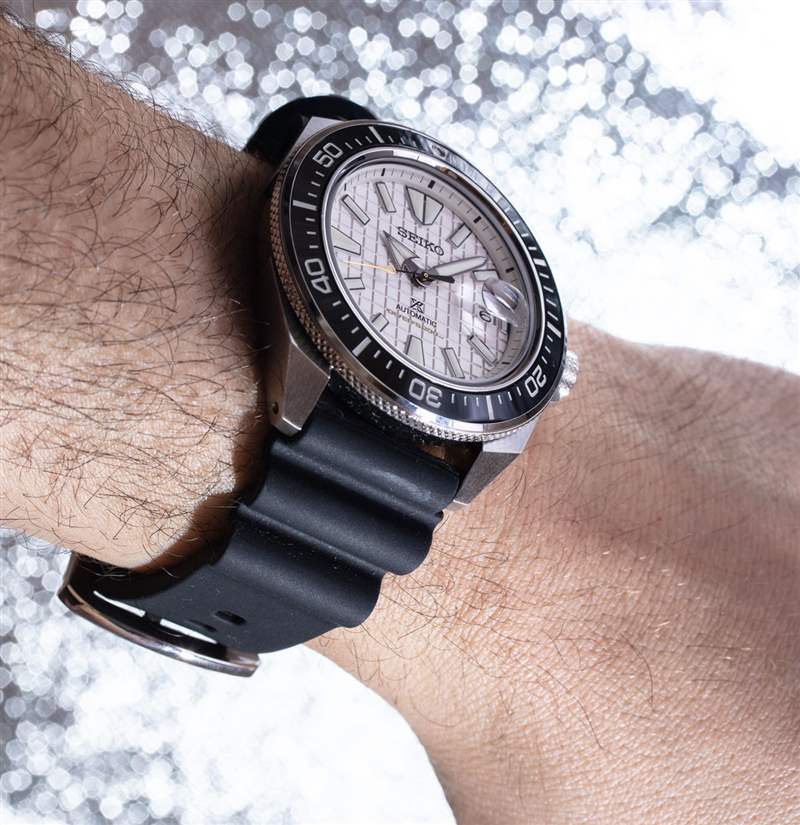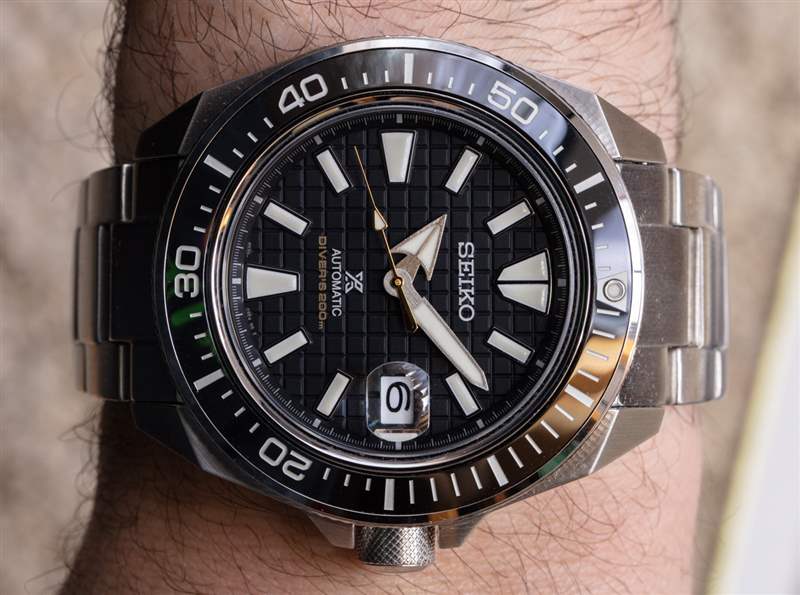 精工專有的 Lumibrite 提供出色的黑暗視覺效果,而整個 King Samurai 表盤非常清晰易讀(即使我希望指針稍微長一點)。藍寶石水晶的底面有 AR 涂層,鑒于其扁平的形狀,幾乎不會產生眩光。44m 寬,King Samurai 也不是一只小手表,但它非常舒適,尤其是在表帶上。精工的表鏈和表帶選項既耐用又保守,但多年來,手表愛好者已經改進并進一步個性化了精工潛水表的外觀,將它們放在一系列可用的第三方表帶上。為了使這些 King Samurai 手表脫穎而出,我當然建議買家考慮這樣做。