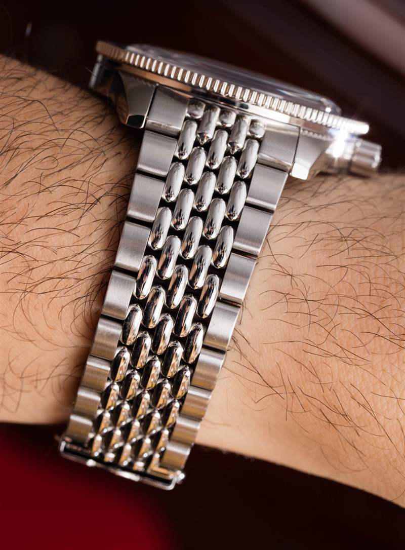 防水深度達 200 米,42 毫米寬的表殼感覺比其 12 毫米厚度可能暗示的要薄。部分原因可能是由于柔軟且傳統(tǒng)上薄的鋼表鏈。中間的“米粒”鏈節(jié)經(jīng)過拋光處理,兩側(cè)是更寬的拉絲鋼鏈節(jié)。手鐲也從連接到表殼的地方逐漸變細。數(shù)量不多,但錐形有助于使整體設(shè)計感覺更加精致,并增加佩戴舒適度。