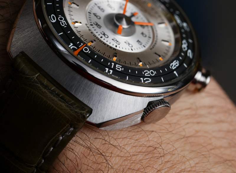 Track 1(最初的名稱實(shí)際上是 Speed Hunter ——但該名稱將保留給其他名稱)手表設(shè)計的全部意義在于使模擬計時碼表更清晰易讀。大多數(shù)機(jī)械計時手表依靠子表盤來指示大部分計時信息。這些子表盤位于其他指針下方,對于許多手表愛好者來說,閱讀大多數(shù)模擬計時手表的過程并不簡單或快速。因此,Marco 想要做的是將表盤的整個中心都專用于計時碼表,而將時間放在別處。