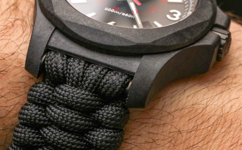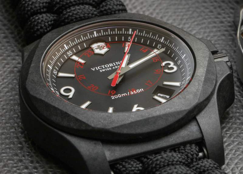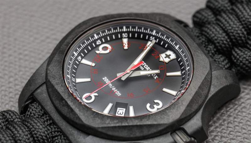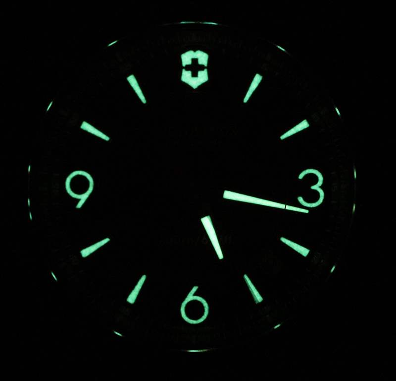 Luminant 既適用于迷人(且尺寸適中)的指針,也適用于時標。雙排較小增量的標記排列在法蘭環上。較低的用于秒針(我很高興地報告,我的 Victorinox Swiss Army INOX Carbon 有一個與標記完美對齊的秒針),而上面的只是為了風格 – 因為這些將用于計時碼表,并不是對這個運動有用的標記。這并不是真正的缺點,而只是計時純粹主義者會注意到的一個小怪癖。