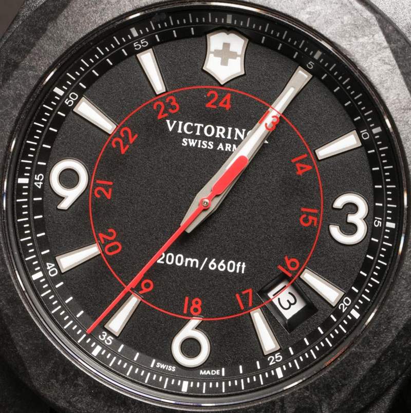 Victorinox Swiss Army INOX Carbon 的表盤設計在幾個方面進行了更新,我已經提到了 24 小時計時圈的位置。3、6 和 9 點鐘位置的時標是阿拉伯數字,而其余時標是棒狀索引或 12 點鐘位置的品牌標志,您還可以看到更加軍事化的外觀。不要忘記,INOX 的耐用性測試之一是確保即使受到嚴重沖擊,所使用的時標仍保持在原位。