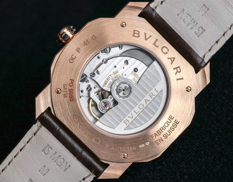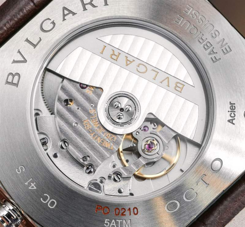 Bulgari Octo Roma 內部是 Bulgari 內部制造的 Calibre BVL 191 自動機芯,可以從表殼背面??透過藍寶石水晶窗看到。機芯以 4 赫茲(28,800 次/小時)的頻率運行,動力儲存約兩天。BVL 191“Solotempo”機芯在 3 點鐘位置提供帶秒針的時間和日期指示窗口(不會切斷時標)。