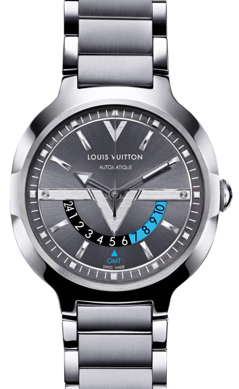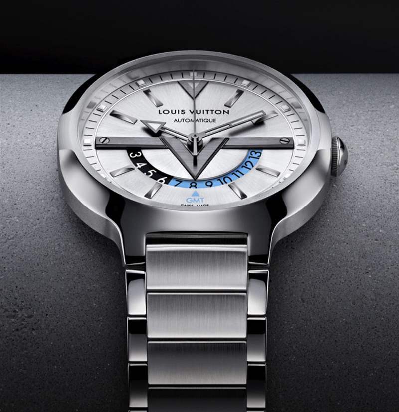 表殼的獨特形狀不僅源于整體輪廓,還在于表殼本身的各種角度和曲線。Voyager GMT 腕表最具爭議的地方在于表盤。這不是 Louis Vuitton 第一次在品牌推廣方面有點“雄心勃勃”,但在這里他們更進了一步。GMT盤上指向當前時間的指示箭頭也恰好是Louis Vuitton的大“V”。您再次看到 V 作為 12 點鐘的小時刻度標記,兩個“V”標記夾著路易威登標志。拉絲和刻面 V 形本身看起來很酷,但它們無疑也是表盤設計的重要組成部分。根據您對顯眼品牌的看法,這是好事還是壞事。