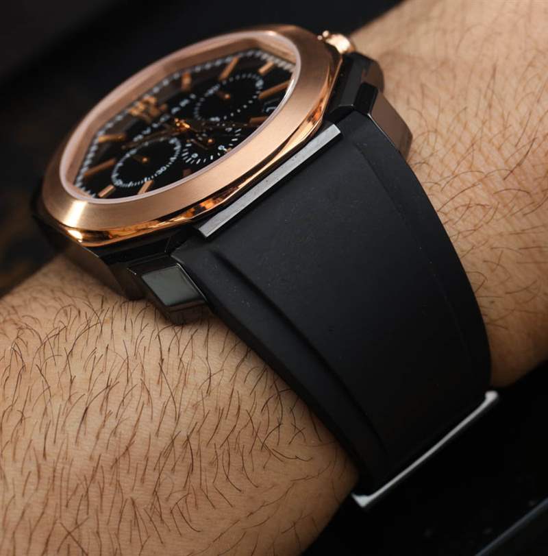 盡管增加了 18k 玫瑰金,但這可能是迄今為止最運動的 Octo 計時碼表之一。這在很大程度上要歸功于新的錐形黑色橡膠表帶,它使手表比以往任何時候都更加舒適。此外,黑色漆面表盤與相配的玫瑰金指針和時標形成鮮明對比,使這款寶格麗 Octo Velocissimo Ultranero 成為同類產品中最易讀的一款。我不會說這款手表很便宜,但采用黑色 DLC 涂層鋼和 18k 玫瑰金,它的價格確實與鋼制勞力士代托納差不多。