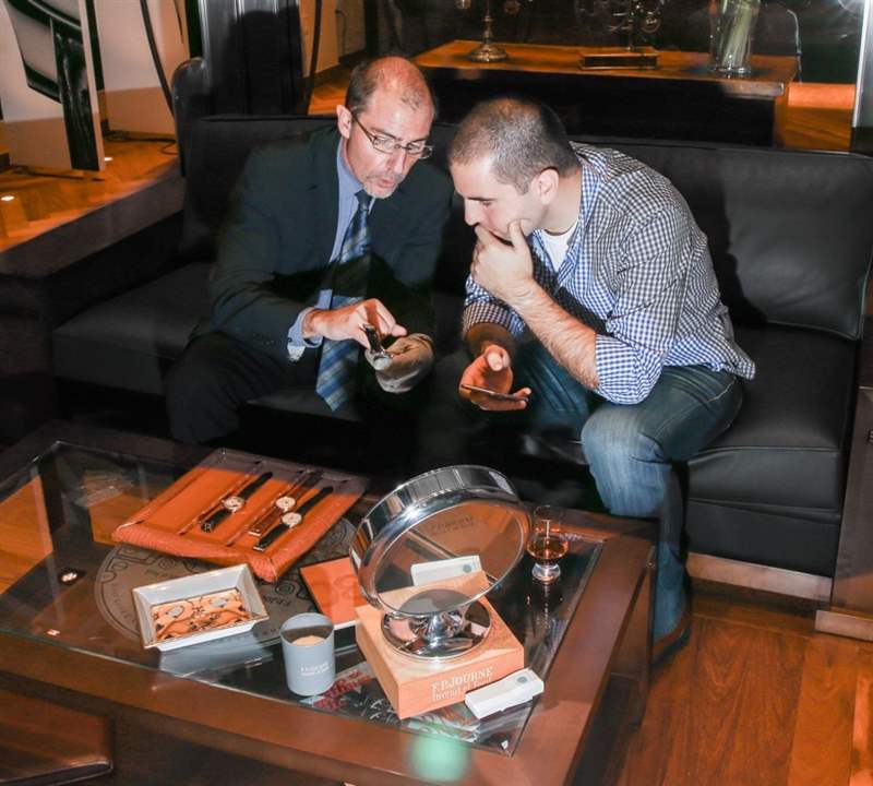 當(dāng)我們受到歡迎時(shí),我們在酒吧里喝了一些蘇格蘭威士忌和濃縮咖啡,然后 Ariel 和我被帶到樓上的私人觀景區(qū)。在那里,Jean-Louis 給我們帶來了一盤我見過的最漂亮的手表。從 Chronometre Bleu、普通版和特殊版 Byblos 開始,然后轉(zhuǎn)向一些 Octa 型號,我認(rèn)真考慮帶著我自己的 FP 手表出去走走。