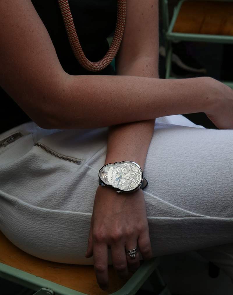 在最初撰寫有關(guān)她的 Memento Mori Skull 手表的近三年后,我親自會(huì)見了設(shè)計(jì)師Fiona Krüger,親眼目睹了由此產(chǎn)生的時(shí)計(jì)。她的故事很有趣,那些想在奢侈品行業(yè)發(fā)家致富的人可以從她的過(guò)程中學(xué)到很多東西。當(dāng)她還是瑞士 ECAL 藝術(shù)學(xué)校的學(xué)生時(shí),她想出了她的 Memento Mori 手表的設(shè)計(jì)。雖然她不是墨西哥人,但她確實(shí)在墨西哥生活過(guò)一段時(shí)間,并受到圍繞亡靈節(jié)慶祝活動(dòng)的多彩有趣和明顯病態(tài)美學(xué)的啟發(fā)。結(jié)合歷史悠久的歐洲鐘表制作的一些元素,這款獨(dú)特的骷髏形腕表誕生了。