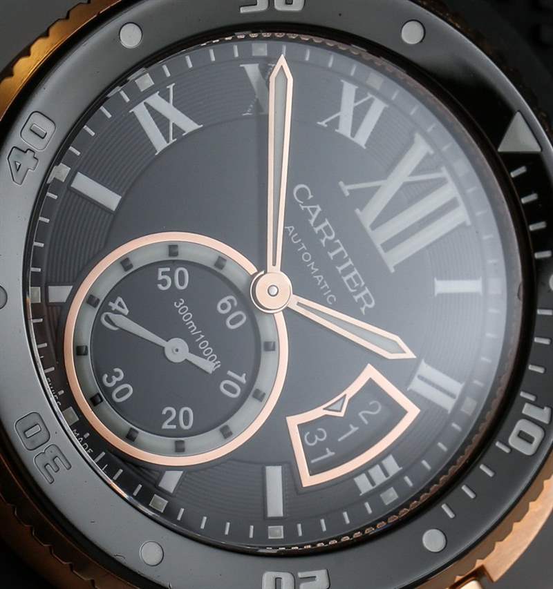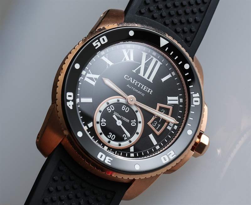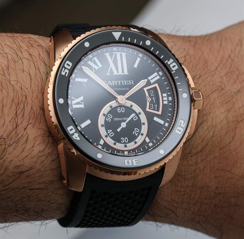 當(dāng)卡地亞 (Cartier) 正式推出卡地亞 Calibre Diver (卡地亞 Calibre Diver) 腕表時(shí),aBlogtoWatch 于 2014 年初在這里進(jìn)行了親身體驗(yàn)。在那里您可以看到精鋼版本和 18k 玫瑰金版本的實(shí)際操作圖像。明明是運(yùn)動(dòng)手表,我們?yōu)槭裁匆獙彶辄S金版?嗯,首先,我覺(jué)得黑色表盤(pán)搭配玫瑰金表殼很醒目,其次,我覺(jué)得既然是一款奢華的生活方式運(yùn)動(dòng)表,為什么不把奢華的元素發(fā)揮到淋漓盡致呢。