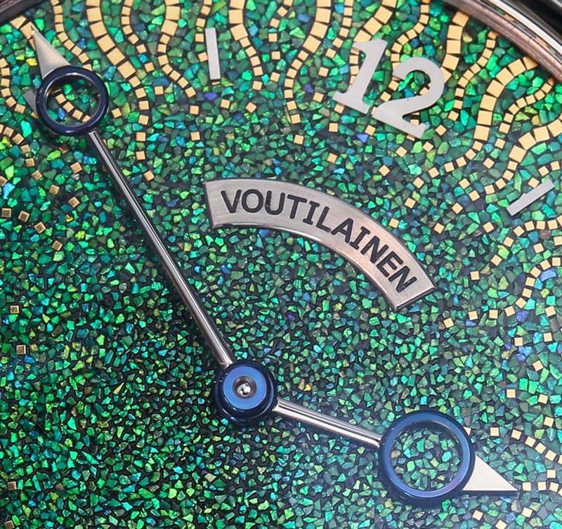 這不是Kari Voutilainen第一次與日本國寶和傳奇漆器藝術家 Kitamura Tatsuo(也稱為“Unryuan”)合作。Kitamura 的工藝品有多種不同的形式,當他與 Voutilainen 合作時,通常是精心手工組裝的馬賽克表盤,這些表盤結合了黃金和軟體動物貝殼等一系列自然元素和材料。這款手表叫做 Voutilainen 28 Hisui,在日語中是玉的意思,看看 Voutilainen 28 Hisui 的表盤顏色,就很容易看出原因了。