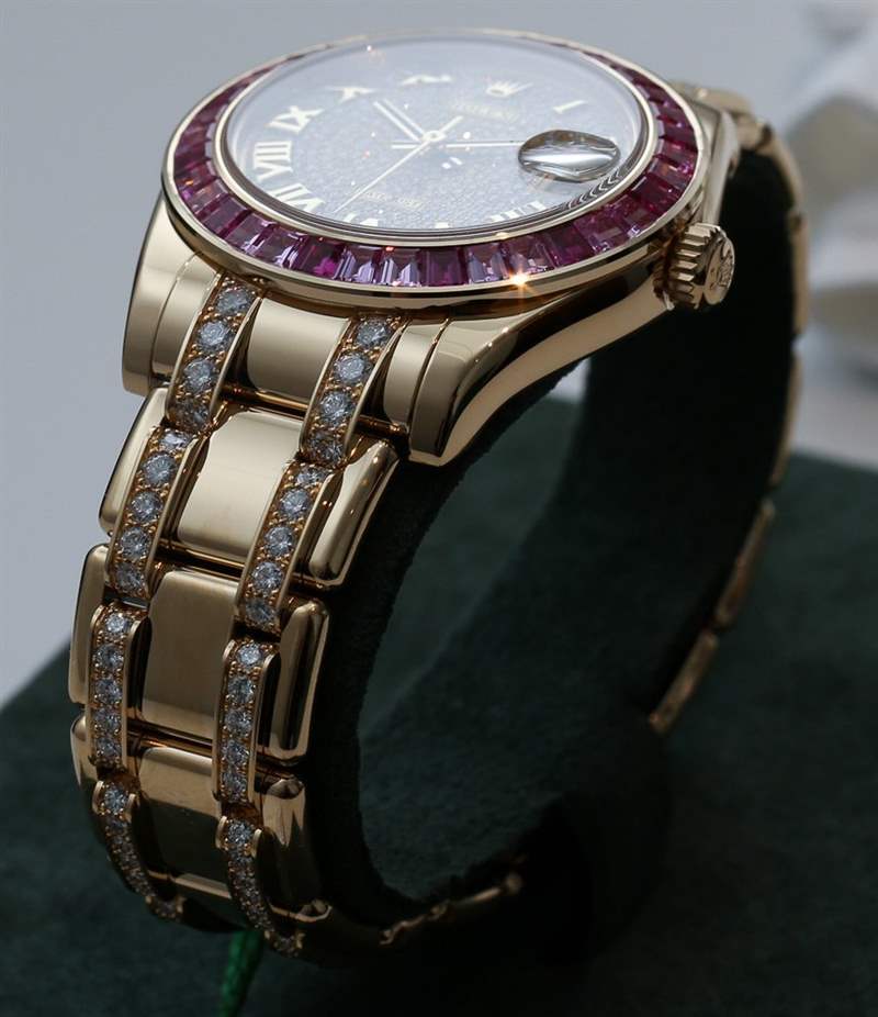 作為珠寶手表,有很多值得欣賞的地方。例如,在應(yīng)用小時(shí)刻度之前,表盤(pán)是手工鑲嵌鉆石的。如果您仔細(xì)觀察表圈,您會(huì)發(fā)現(xiàn)勞力士在每個(gè)時(shí)標(biāo)點(diǎn)選擇顏色稍深的寶石。當(dāng)然,所有寶石均由勞力士?jī)?nèi)部手工鑲嵌,品質(zhì)卓越。每款 Pearlmaster 腕表均可選配鑲鉆手鏈。