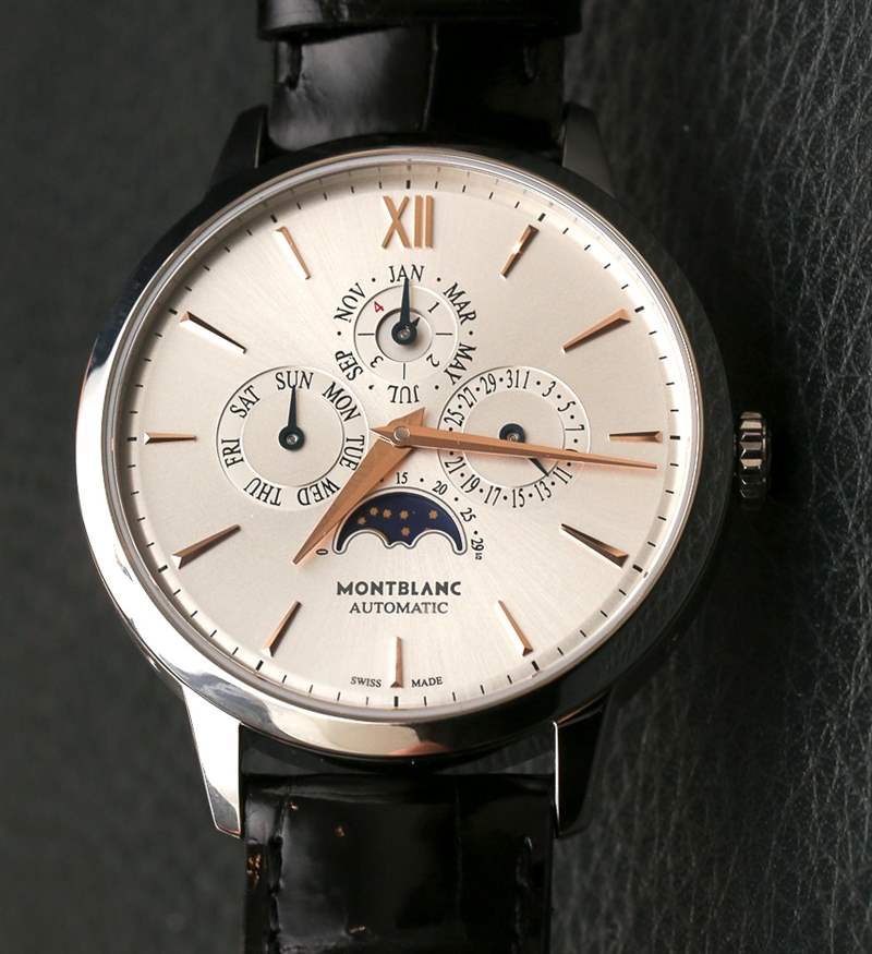 萬年歷 39 毫米寬,厚度僅約 10 毫米。鑒于機(jī)芯是帶模塊的底座,這非常好。Monblanc 將提供精鋼和 18k 玫瑰金萬年歷。真正的價(jià)值當(dāng)然在于帶有玫瑰金指針和小時(shí)市場貼花的精鋼表殼。這將是一個(gè)萬年歷——一個(gè)不錯(cuò)的——價(jià)格是大多數(shù)人以前從未見過的。