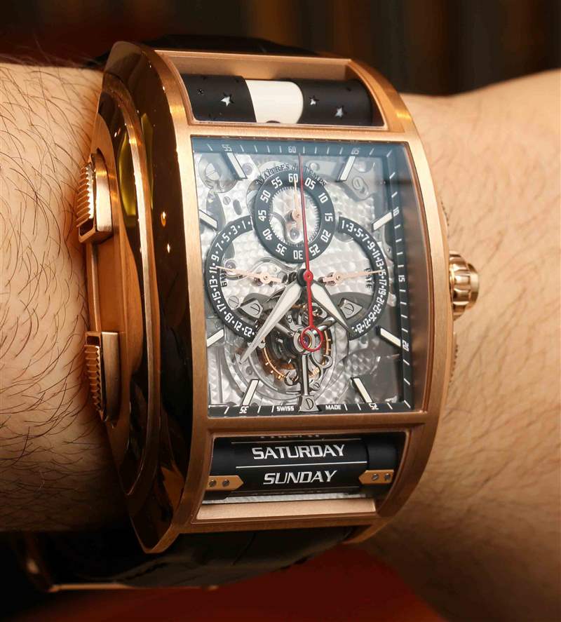 滾輪是第一章模型如此龐大的原因之一。滾輪主要由鋁制成,是該系列設計 DNA 的重要組成部分。它們用于在手表的頂部指示月相,在手表的底部指示星期幾。Chapter One 手表的另一個獨特之處(我認為其他任何手表都不存在)是按鈕中的特殊安全桿。推動者不是第一章所缺乏的東西。實際上,整個案件中有五個。