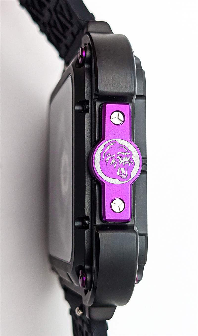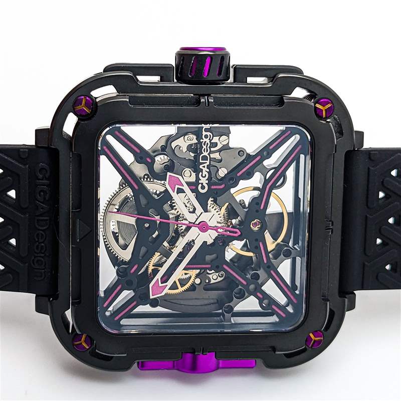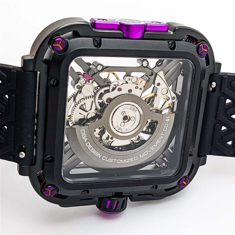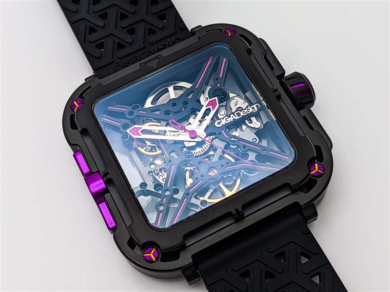 CIGA Design Series X Gorilla 采用 44 毫米寬的圓角方形鏤空表殼設(shè)計(jì),無可否認(rèn)在手腕上顯得格外重要。由 DLC 涂層不銹鋼和 2 級(jí)鈦混合制成,這與入門級(jí)手表設(shè)計(jì)一樣狂野和前衛(wèi),采用雙層表殼系統(tǒng),外殼環(huán)連接到階梯式內(nèi)表殼通過一組四個(gè)減震彈簧。CIGA Design 聲稱這是第一個(gè)安裝在手表表殼上的抗震懸掛系統(tǒng)(盡管它與 Formex 多年來使用的表殼彈簧系統(tǒng)非常相似),并用一組醒目的紫色涂層螺絲突出這些彈簧. 橡膠表冠和表殼 9 點(diǎn)鐘方向的更多紫色點(diǎn)綴為設(shè)計(jì)增添了一些真正引人注目的亮點(diǎn),特別是與 9 點(diǎn)鐘位置的印刷大猩猩徽章搭配使用時(shí)(X 系列大猩猩的其他變體將這些紫色點(diǎn)綴換成了橙色、紅色、藍(lán)色或金色的亮點(diǎn))。雖然大部分表殼都是簡單的啞光黑色,但 CIGA Design 確實(shí)在表殼邊緣和表圈上添加了細(xì)長的拋光倒角,以作為手腕上有效的邊緣亮點(diǎn)。這種表圈設(shè)計(jì)也是 Series X Gorilla 唯一的一組小時(shí)和分鐘標(biāo)記,帶有尖角以指示表盤上的每五分鐘間隔。雖然這是使完整的骨架設(shè)計(jì)在紙面上更清晰易讀的巧妙解決方案,但在實(shí)踐中,這仍然會(huì)導(dǎo)致一目了然的準(zhǔn)確閱讀出現(xiàn)一些困難,尤其是方形表殼的形狀。廣告留言廣告信息結(jié)束