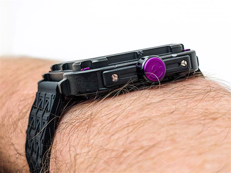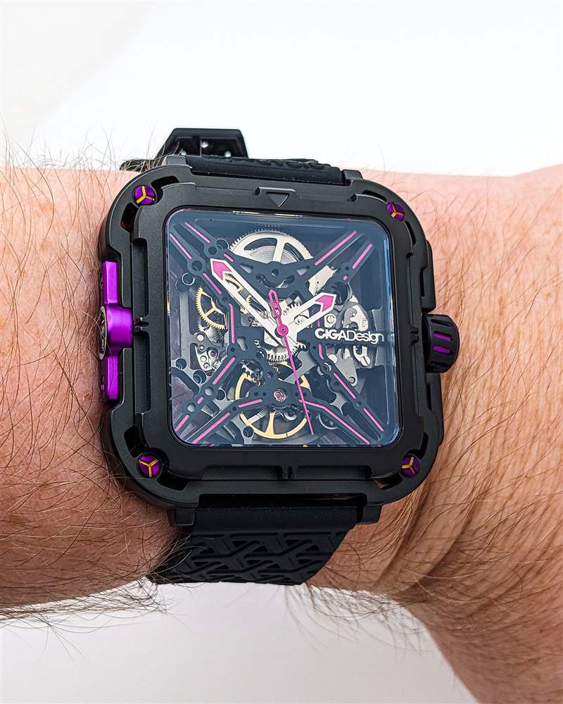 以入門級(jí)價(jià)格找到真正定制的全鏤空表盤并不常見,但 CIGA Design Series X Gorilla 在這里提供動(dòng)態(tài)高端外觀。Series X 命名法來自中央 X 形鏤空表盤,它也可用作華麗的機(jī)芯橋板。CIGA Design 在此延續(xù)紫色主題,在鏤空腕表的手臂上涂上紫色 Super-LumiNova 夜光細(xì)條,并在拋光鏤空直劍形指針和中央棒形秒針上點(diǎn)綴紫色點(diǎn)綴。紫色在現(xiàn)代制表業(yè)中是一種罕見的顏色,與 Series X Gorilla 的前衛(wèi)風(fēng)格相結(jié)合,在這個(gè)細(xì)分市場中打造出真正獨(dú)一無二的外觀。然而,值得注意的是,這種 lume 應(yīng)用較弱,只能在短時(shí)間內(nèi)發(fā)出暗淡的綠色光。鑒于這個(gè)價(jià)位的其他品牌,尤其是 Seiko,能夠提供出色的 lume 工作,這是一個(gè)潛在的缺點(diǎn),值得注意。與此相關(guān)的是,與大多數(shù)骨架設(shè)計(jì)一樣,X 系列大猩猩乍一看可能難以閱讀,但拋光手機(jī)與黑色骨架表盤形成鮮明對(duì)比確實(shí)在一定程度上緩解了這個(gè)問題。
