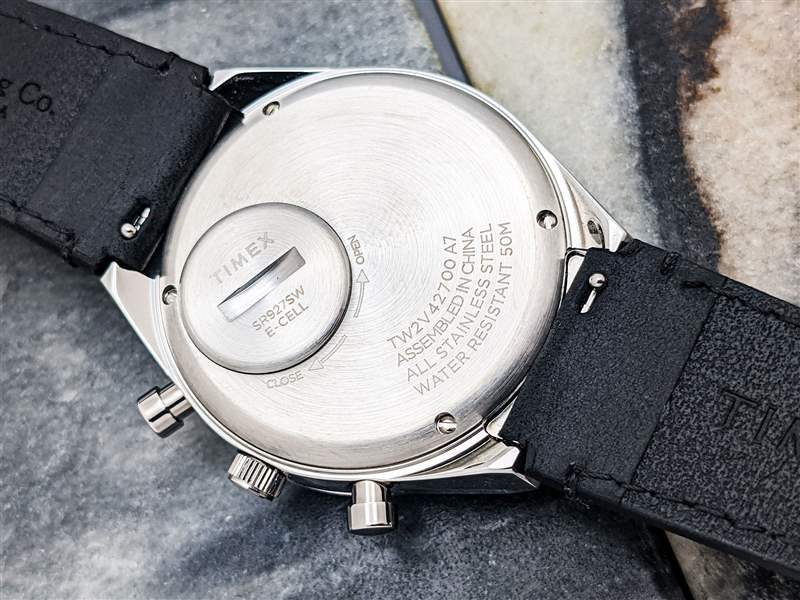 Timex 為 Q Timex 計時碼表配備皮革表帶或不銹鋼多鏈節表鏈。我們的評測樣品采用黑色皮革表帶送達,這條表帶很快成為這款手表最令人印象深刻的功能之一。由位于明尼蘇達州紅翼市的一家美國制革廠聯名打造,開箱即用,帶來柔軟、厚實、柔順的穿著體驗,啞光表面展現出豐富的細微細節。這款表帶在舒適度和美觀方面均能與價格相媲美數倍的手表相媲美,并且非常注重細節,包括帶槽口的末端,讓表帶更順暢地融入表殼的線條。