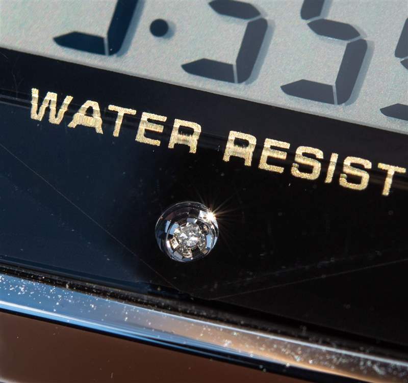 好吧,我們已經到了鉆石的時候了。因為這款手表最有趣的地方并不在于它驚人的易讀性或可接受的手腕感覺。它是這個特定的卡西歐 A159WAD-1D 參考型號(以及其他三個型號,其金色替代品 A159WGED-1 和兩個較小的版本,即 LA670WEAD-1EF 和 LA-670WGAD-1D)的獨特之處:兩顆鉆石顯示相當顯眼地位于顯示屏的上方和下方,在以模仿鉆石的方式刻面的前玻璃元件下方。