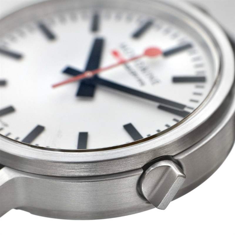 對我來說,這是 Stop2Go 時計最好的部分。機芯很有趣,但新的表殼設(shè)計非常好。精鋼材質(zhì)的拉絲表殼寬 41 毫米,與人們通常認為的典型 Mondaine 外觀相比,具有更現(xiàn)代的工業(yè)設(shè)計。一個獨特的特點是表冠,其設(shè)計看起來像一個翹板開關(guān)。希望它不會太難拔出,但它看起來確實不錯。這可能是我很長一段時間以來最喜歡的新款 Mondaine 手表。