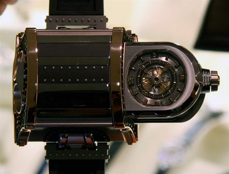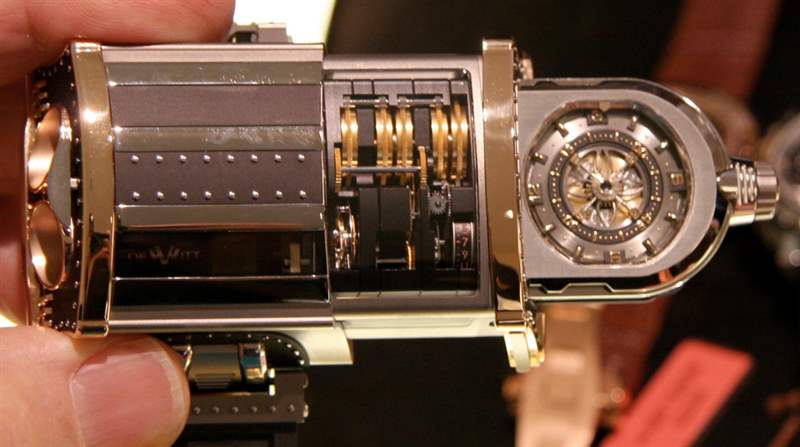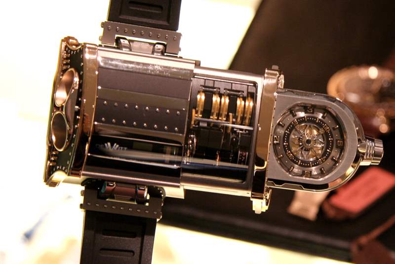 將WX-1表殼平穩(wěn)地推回一起,我意識到手表上的窗戶都是藍寶石水晶,很難以這些形狀制造。這只手表給我留下了深刻的印象,并很高興看到它掌握在別人手中。關(guān)于設(shè)計有什么要說的?我屈服于這樣一個事實,即每個人都有自己的。我喜歡它的外觀(盡管 WX-1 似乎并不關(guān)心我的想法),我認為它是儒勒凡爾納式的。就像維多利亞時代的宇宙飛船。有些人會把這種外觀定義為“蒸汽朋克”,我不會不同意。Vianney Halter圍繞蒸汽朋克美學(xué)成功打造了自己的整個高端手表品牌,概念精湛。WX-1符合所有這些標簽,但它沒有特別模仿。表殼周圍的詳細鉚釘旨在表示投入手表的勞動。那雙手把這個杰作放在一起,一個鉚釘一個鉚釘,而不是機器。以最精致的形式真正創(chuàng)造體力勞動,將工程與藝術(shù)相結(jié)合,只有鐘表業(yè)才能傳達,并在這款DeWitt中清晰地重視。