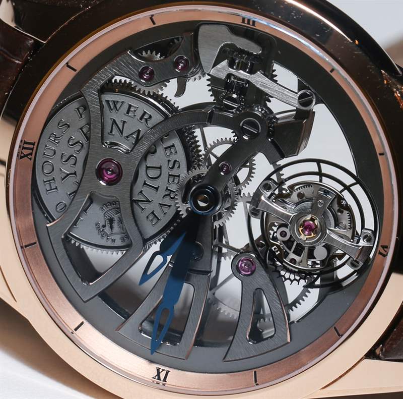 對于雅典表來說,這款腕表是首創。當然不是他們的第一個自制機芯,也不是他們的第一個陀飛輪,而是他們的第一個自制鏤空陀飛輪。該機芯從頭開始設計為鏤空設計——這意味著雅典表不只是將現有機芯鏤空。新機芯為 UN-170 機芯,動力儲存高達 170 小時。不幸的是沒有動力儲存指示器,但那是很長的時間。因此,有了大約一周的動力儲存,您只需記得每個星期天晚上為您的 Skeleton Tourbillon Manufacture 手表上鏈。事實上,雅典表在這方面做得很巧妙。發條盒上刻有“170 小時動力儲存”字樣。這很重要,因為它可以讓您隨時回憶手表的電量。大多數人在拿到手表時要么忘記,要么永遠不會被告知動力儲存長度。因此,Ulysse Nardin 確保多年后您會記得這個事實。