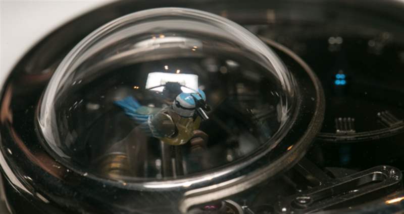 當(dāng)然,The Charming Bird 也是一款腕表。鳥形氣泡上方是一個(gè)偏心顯示的時(shí)間,只有分鐘和小時(shí)。整個(gè)機(jī)芯是 100% 機(jī)械的。Calibre 610 手動(dòng)上鏈機(jī)芯具有 40 小時(shí)的動(dòng)力儲(chǔ)存,報(bào)時(shí)部分僅占據(jù)表盤的上部,因?yàn)楸砉谖挥?12 點(diǎn)鐘位置。