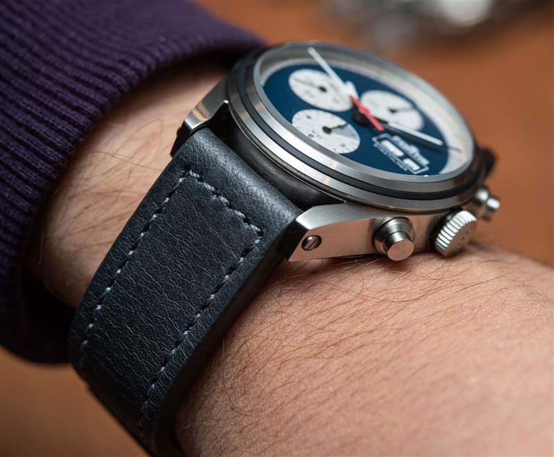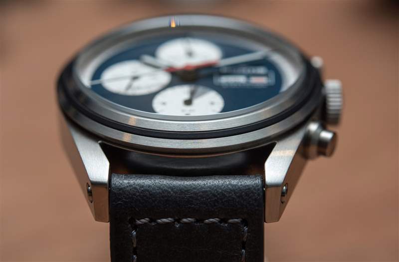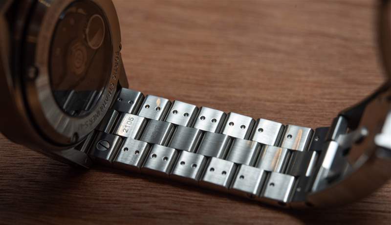 41 毫米寬的表殼采用再生不銹鋼制成,在金屬中觀看時(shí)最能欣賞到美感。塊狀表耳以強(qiáng)烈的曲線打造出平流層的輪廓,配有兩個(gè)倒置的按鈕和被橡膠條分成兩半的表圈。就像表盤一樣,表殼乍一看也很簡(jiǎn)單——可以說(shuō)太簡(jiǎn)單了,但這種設(shè)計(jì)會(huì)通過(guò)長(zhǎng)時(shí)間的佩戴展現(xiàn)出經(jīng)過(guò)深思熟慮的新細(xì)節(jié)。表殼和表鏈感覺可以使用很長(zhǎng)時(shí)間——不僅僅是因?yàn)樗鼈兊膲K狀設(shè)計(jì),還因?yàn)樗鼈兊馁N合度和表面處理。一個(gè)典型的例子是帶有三個(gè)墊圈的旋入式表冠,按鈕的精確配合保證了 200m(660ft)的防水性能,這適合在真正的手表愛好者的監(jiān)督下制造的手表。