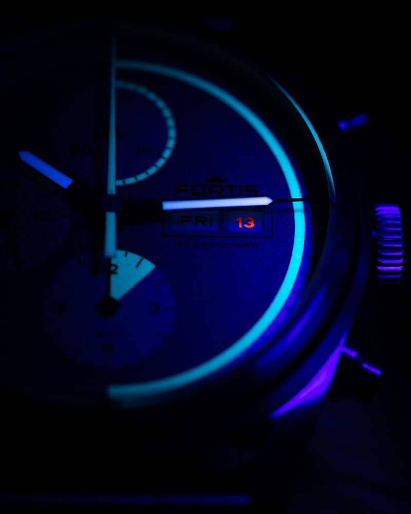 Stratoliner 有多種表盤組合可供選擇,就連貫性和獨(dú)特性的理想融合而言,極地白色和藍(lán)色表盤可能是其中最好的。Fortis 為其表盤的纖薄而感到自豪,而且小表盤是平坦的,而不是凹陷的;日期和星期顯示都比平常更清晰,更靠近水晶。指針大而易讀,具有強(qiáng)烈的夜光和黑色輪廓,注射器式分針以精致的刻度準(zhǔn)確地指示分鐘。雖然繁忙的秒針刻度非常適合準(zhǔn)確讀取計(jì)時(shí)秒針,但它使分鐘的讀取變得復(fù)雜。由于每隔五個(gè)位置沒有一個(gè)大的時(shí)標(biāo),因此以分鐘的精度報(bào)時(shí)需要一些時(shí)間來(lái)適應(yīng)。