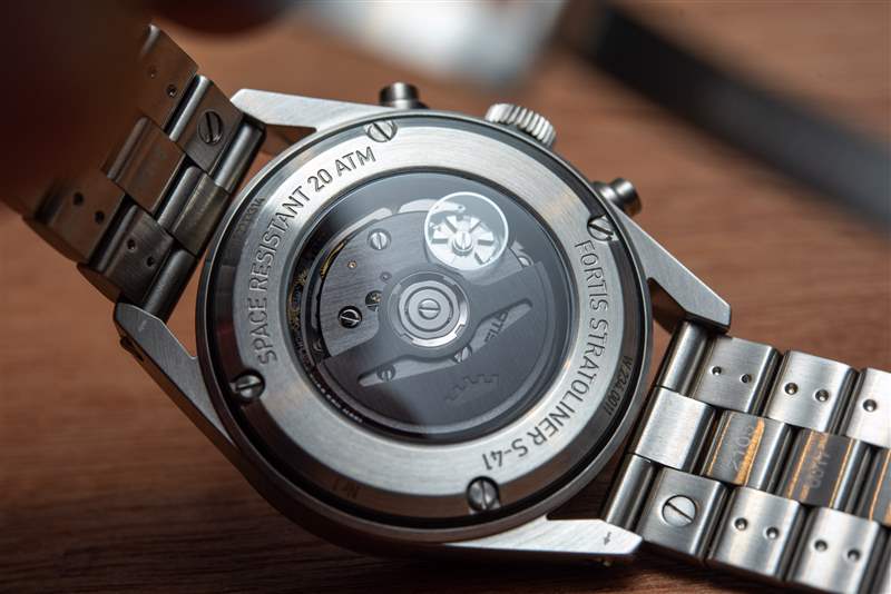 Fortis Stratoliner 由 Fortis Werk 17 提供動(dòng)力 – 請(qǐng)注意,它不是 法語(yǔ)中的 “機(jī)芯” ,而是德語(yǔ)中的“werk ”,暗示了該品牌的 Grenchen 基地。如果您是 Fortis 的鐵桿粉絲,您會(huì)稱其為 Werk siebzehn(德語(yǔ)中的“17”)。Werk 17 是一款經(jīng)過(guò)“平流層測(cè)試”的自制機(jī)芯,與高端機(jī)芯制造商 La Joux-Perret 合作制造,而非計(jì)時(shí)碼表 Fortis Werk 13 則由勞力士-都鐸-香奈兒旗下的 Kenissi Manufacture 制造。Werk 17 結(jié)合了 60 小時(shí)的動(dòng)力儲(chǔ)存、軸承式自動(dòng)上鏈系統(tǒng)和導(dǎo)柱輪操作的計(jì)時(shí)碼表。
