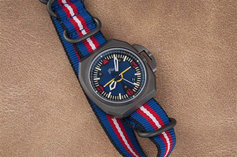 復雜的刻度環(由三顆可見螺釘固定)在四分之一處設有軍事風格的數字,而 12 點鐘處的三角形則向更傳統的飛行員手表致敬。其上方的改造具有額外的標記,包括每隔五分鐘的數字以及位于 3 點、6 點、9 點和 12 點位置的小夜光圖。4點30分的日期肯定會讓人兩極分化,但3點或6點的位置根本沒有空間。我對此表示同意,因為我更喜歡帶有日期的工具表,但將數字旋轉到水平方向會是一個不錯的選擇。表盤有很多功能,所以它不像正裝手表或淺色表盤的手表那樣引人注目。