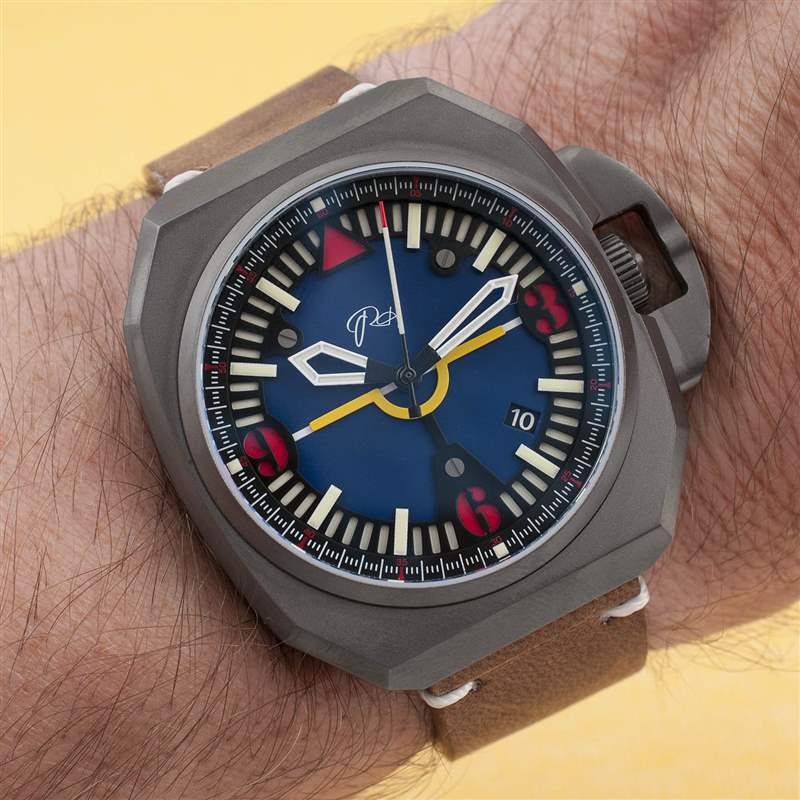 這款手表的名字來源于飛機上的姿態計(不要與高度混淆),指示飛機相對于地平線的方向。雖然靈感顯而易見,但它很微妙,不會打在你臉上,也不會讓人感覺像是在向 Bell & Ross 致敬。帶有藍色 AR 涂層的藍寶石水晶玻璃使表盤清晰可見。廣告留言廣告信息結束