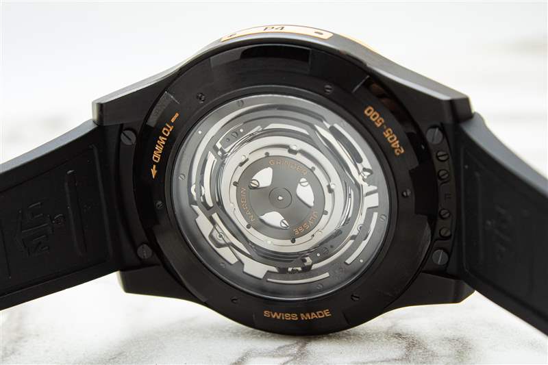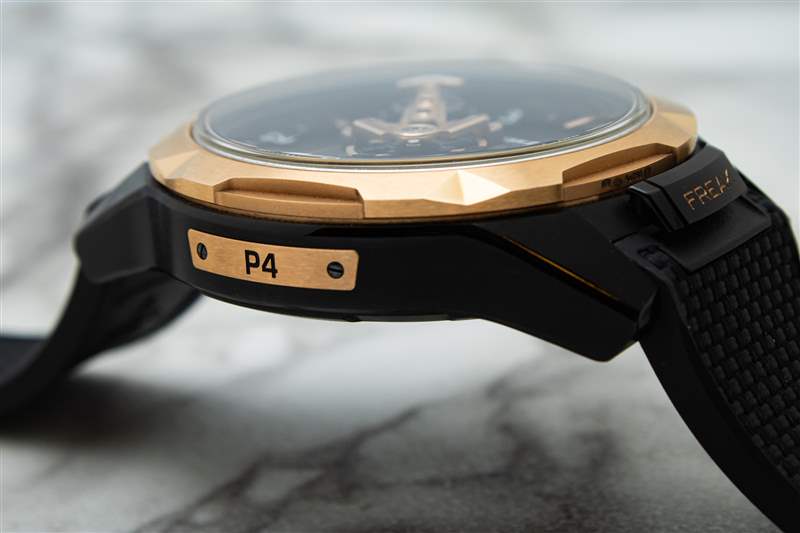 當(dāng)然,實(shí)際上 Freak ONE 并沒有什么平庸之處,仔細(xì)觀察紅金表圈就可以立即看出這一點(diǎn)。基于這種拉絲和拋光元件中尖銳的刻面圖案,這個(gè)表圈可能看起來不對齊,但這是 Freak ONE 獨(dú)特的上鏈和時(shí)間設(shè)置系統(tǒng)的唯一真正的視覺線索。翻轉(zhuǎn) 6 點(diǎn)鐘位置的“Freak”牌,旋轉(zhuǎn)表圈就會解鎖,但旋轉(zhuǎn)的不僅僅是表圈本身。扭轉(zhuǎn)這個(gè)雙向表圈還可以向前和向后調(diào)整時(shí)間設(shè)置,為佩戴者提供與 Freak ONE 啟動(dòng)對話的齒輪系的大規(guī)模觸覺連接。在背面,藍(lán)寶石顯示屏底蓋同樣非正統(tǒng)。通過逆時(shí)針旋轉(zhuǎn)底蓋外環(huán),佩戴者可以手動(dòng)為機(jī)芯上弦,盡管 Freak ONE 的創(chuàng)新上鏈系統(tǒng)使得這一點(diǎn)基本上沒有必要(稍后會詳細(xì)介紹)。雖然 Freak ONE 的外殼非常耐磨,而且充滿了有趣的花招,但它的致命弱點(diǎn)就是防水。這是該手表日常佩戴理念面臨的最大障礙,因?yàn)?30 米的深度等級讓 Freak ONE 根本無法勝任許多運(yùn)動(dòng)場合的任務(wù)。