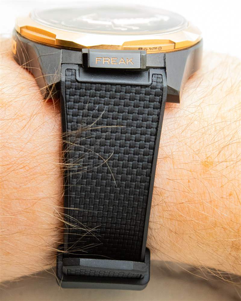 為了完善 Freak ONE 時(shí)尚且(相對而言)微妙的黑金外觀,雅典表為這款腕表搭配了簡約黑色的紋理織物效果橡膠表帶。雖然這條表帶柔軟且相當(dāng)舒適,但可以說它缺乏其他設(shè)計(jì)的一些特色。然而,作為 Freak ONE 奇特之處的最后一層,這條表帶以相反的方式安裝,唐扣末端位于 6 點(diǎn)鐘位置。表面上這樣做是為了在 6 點(diǎn)鐘表殼一側(cè)的“Freak”銘牌上留出一個(gè)凹口,但它確實(shí)增強(qiáng)了佩戴者的感覺,雅典表憑借這款腕表隨著自己的鼓點(diǎn)起舞。