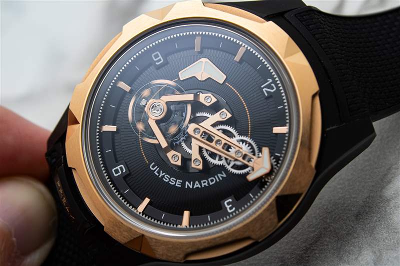 與表殼一樣,雅典表 Freak ONE 的鏤空表盤以之前的 Freak 型號為基礎(chǔ),但以更簡潔、更精致的方式呈現(xiàn)了這些概念。嚴(yán)格來說,只有帶有淺色印刷阿拉伯?dāng)?shù)字和鑲貼金質(zhì)時(shí)標(biāo)的狹窄外圈是真正的表盤表面,藍(lán)寶石水晶下方的所有其他部件都是機(jī)芯部件。大部分空間被一個(gè)寬大的啞光黑色圓盤占據(jù),圓盤上有精致的脊?fàn)罴y理,并印有雅典表的文字標(biāo)志。由于此處采用寬大且?guī)в写罅恳构獾慕鹕切涡螤睿撔D(zhuǎn)圓盤可用作時(shí)針。然而,真正搶盡風(fēng)頭的是分針。這是 Freak 系列的標(biāo)志性碟形盤,這是一個(gè)旋轉(zhuǎn)齒輪系組件,每小時(shí)在表盤上繞一圈,本質(zhì)上允許機(jī)芯,圍繞自身旋轉(zhuǎn)。與之前的 Freak 迭代相比,該組件在視覺上顯著簡化,但 Ulysse Nardin 在形式上添加了對其自身傳統(tǒng)的厚顏無恥的認(rèn)可。包含齒輪系組件和分鐘標(biāo)記的主橋結(jié)構(gòu)也形成了該品牌的標(biāo)志性錨徽。錨標(biāo)志出現(xiàn)的唯一其他地方是表帶襯里,這使得這是一個(gè)令人印象深刻的克制品牌活動(dòng)。飛行擺輪橋作為分針的配重,與鏤空表盤表面上方的齒輪系一起旋轉(zhuǎn),成為動(dòng)態(tài)的視覺亮點(diǎn)。此外,由于擒縱機(jī)構(gòu)安裝在旋轉(zhuǎn)組件上,F(xiàn)reak ONE 在技術(shù)上還具備 60 分鐘陀飛輪復(fù)雜功能。這是最頑固的運(yùn)動(dòng)書呆子們的話題,
