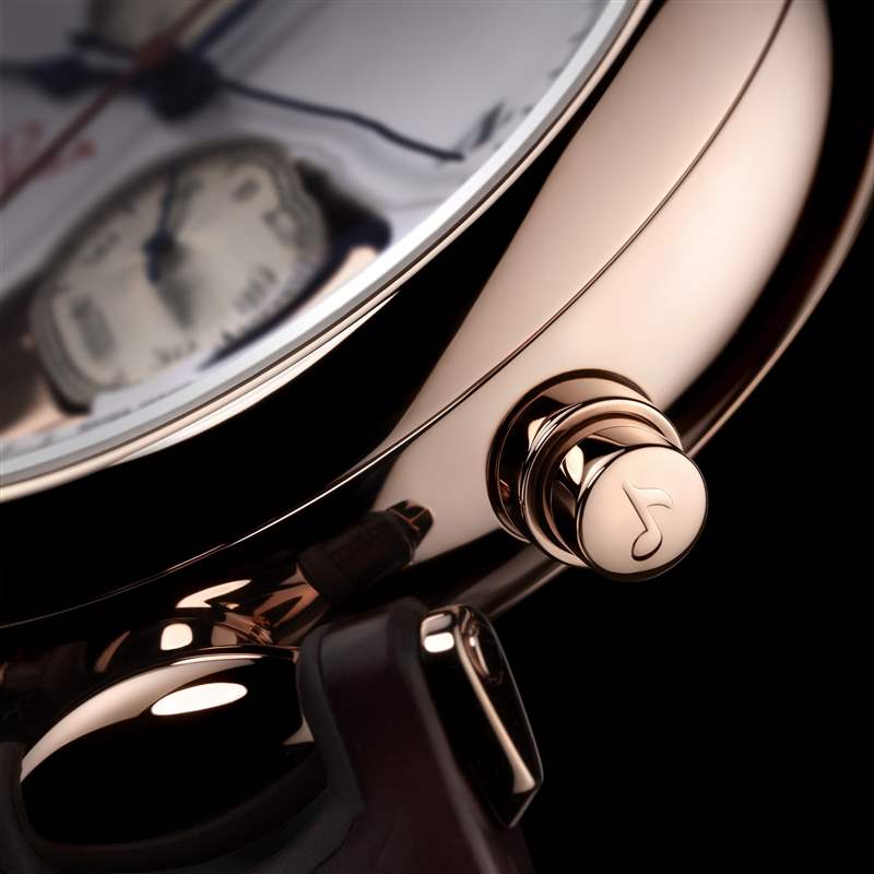 根據品牌提供的視頻資料,這款被稱為具備「計時鳴報」(Chrono Chime)功能的機芯能夠清亮地鳴報出計時時間信息,與人們習慣已久的普通三問表報時方式很不相同——音槌首先敲擊低音簧鳴報分鐘,然后2個音槌共同敲擊出雙音代表10秒鐘,最后高音錘敲擊報出個位秒鐘。機芯橋板、夾板、音簧等部件均由Sedna 金制成,令報時鳴音更為清脆悅耳。