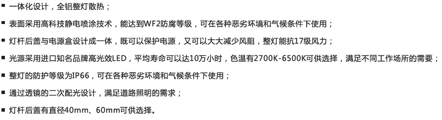適用于主干道、公路、高架橋、市區(qū)街道、天橋、人行道等道路照明,以及學(xué)校、住宅區(qū)等需要戶外照明的場所。