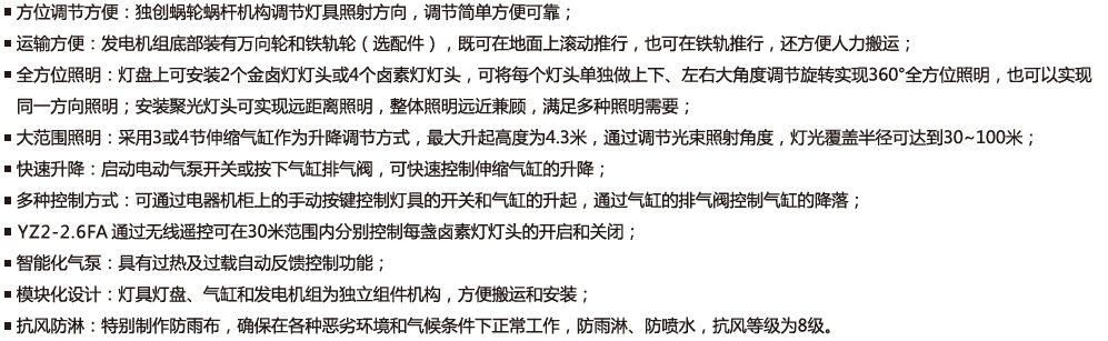 適用于各種大型施工作業(yè)、事故搶修、搶險(xiǎn)救災(zāi)等室內(nèi)外現(xiàn)場(chǎng)做移動(dòng)照明。