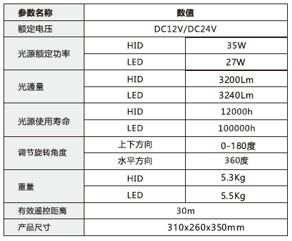 ■ 漫反射反光杯聚光效果好,照明亮度高,光班光色均勻,照射距離可達1200米。并實現(xiàn)了冷熱均能在瞬間啟動點亮。通過遙控器